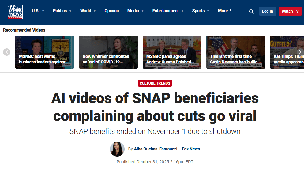 Fox News has a problem: when you build your entire editorial model around feeding your audience’s biases, you stop asking whether the stories feeding those biases are actually true. Case in point: last week, they published—and then quietly rewrote—a story about SNAP recipients threatening to “ransack stores,” based entirely on AI-generated videos that never happened.
