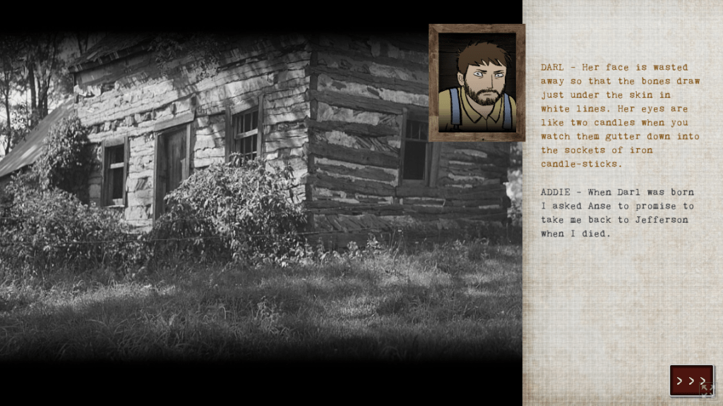 The resource management layer turns As I Lay Flying into a complete game, and it was a strong competitor for Best Digital Game. But even more than that, the game stands out for its graphical ambition, completeness, and attention to detail. Everything is designed to fit into the style and setting, and no interface element is left plain and generic: they are rendered in wood and paint and cloth, with little touches like period-appropriate stamps to mark purchased upgrades. During the main gameplay there are parallax-scrolling backgrounds and physics-based animation of the wagon and its occupants, and the levels are bookended by dialogue and narration scenes illustrated with photos and original character portraits.
