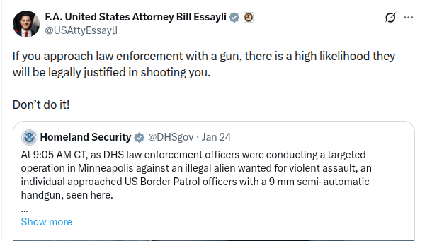 Here’s what Essayli added to his repost of the DHS’s claim that Alex Pretti signed his own death warrant by legally carrying a gun: