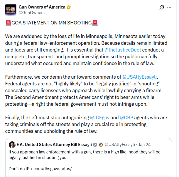 [W]e condemn the untoward comments of @USAttyEssayli. Federal agents are not “highly likely” to be “legally justified” in “shooting” concealed carry licensees who approach while lawfully carrying a firearm. The Second Amendment protects Americans’ right to bear arms while protesting—a right the federal government must not infringe upon.