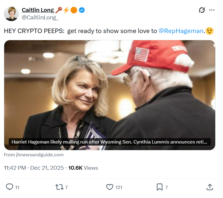 Wyoming’s crypto community is already nudging her in that direction. Caitlin Long, founder of Custodia Bank and a key architect of the state’s blockchain‑friendly laws, praised Hageman as “salt of the earth.” Long was reacting to news of Hageman’s expected entry in the race.