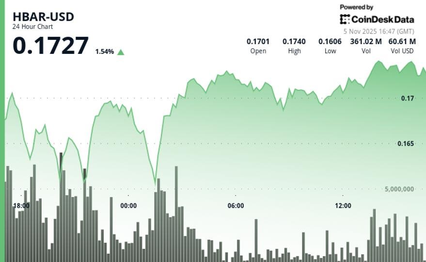 HBAR extended its advance on Tuesday, gaining 1.31% to $0.1725 as trading volume climbed 38% above the 30-day average. The move tracked broader crypto market momentum, supported by steady institutional flows. Despite the lack of fundamental catalysts, elevated activity points to renewed trader interest in the Hedera network token.