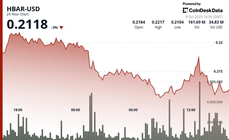 Hedera Hashgraph’s HBAR token fell nearly 5% from $0.22 to $0.21 between Oct. 8 and 9 as institutional caution deepened amid ongoing regulatory uncertainty. Volatility surged to 5.4%, with heavy selling between 01:00 and 08:00 on Oct. 9 pushing volumes above 100 million units per hour. Analysts cited strong resistance at $0.22 and institutional support near $0.21 as key technical levels.