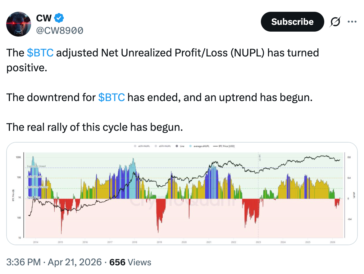 This suggests that the downtrend for Bitcoin has ended, and the “real rally of this cycle has begun,” CW8900 said in another X post.