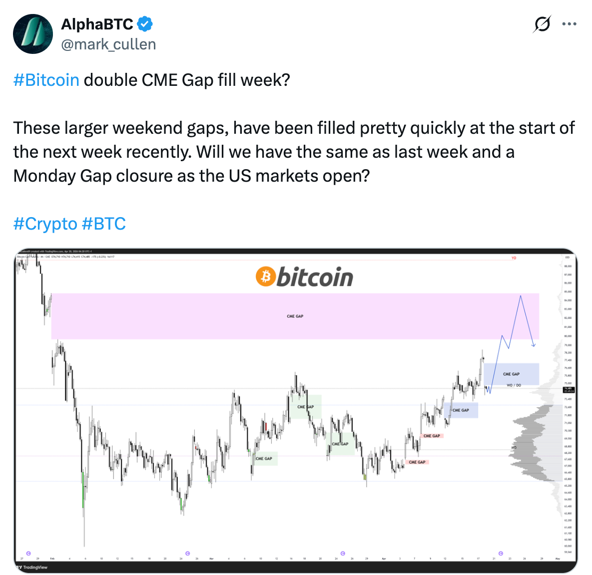 Analyst AlphaBTC said the BTC/USD pair might rise higher to fill the CME gap at $84,000, which was created at the start of February.
