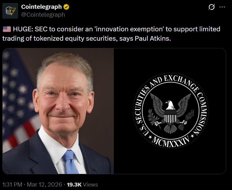 She noted that SEC staff continue to work on a potential “innovation exemption” that could allow limited experimentation with tokenized securities while regulators assess how existing securities laws apply to blockchain-based markets.