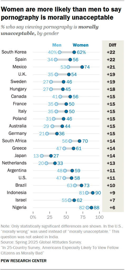 Japan has the most porn-friendly populace: A new survey from the Pew Research Center asked people in different countries whether porn is morally acceptable. Around the world, women were more likely than men to say porn was wrong. Fifty-eight percent of U.S. women and 47 percent of U.S. men said it was wrong. Among women, moral disapproval of porn was highest in Indonesia, Nigeria, Mexico, and Brazil and lowest in Japan, the Netherlands, and Germany. Among men, the highest levels of disapproval were found in Nigeria, Indonesia, and Brazil and the lowest in Japan, the Netherlands, and Germany.