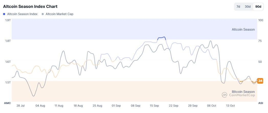 CoinMarketCap’s altseason gauge is even lower at 24, reporting that it is “Bitcoin season” still, while CryptoRank also shows a low of 24, and Bitget’s altcoin season index is at 30.