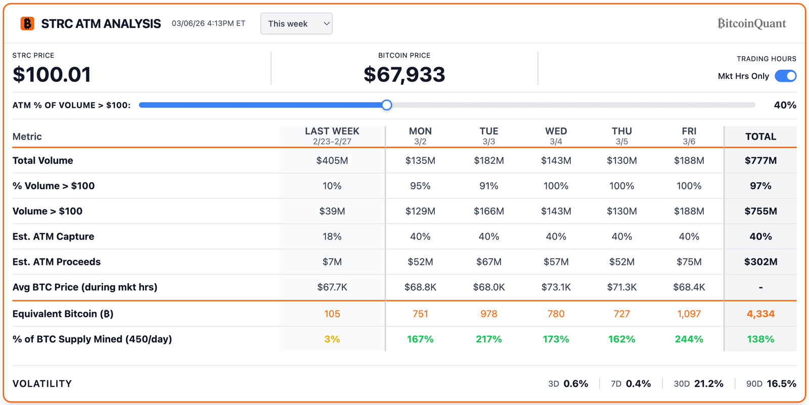 Friday alone saw a record $188 million in STRC trading volume, implying enough potential proceeds to fund the purchase of around 1,097 BTC, based on the same model.