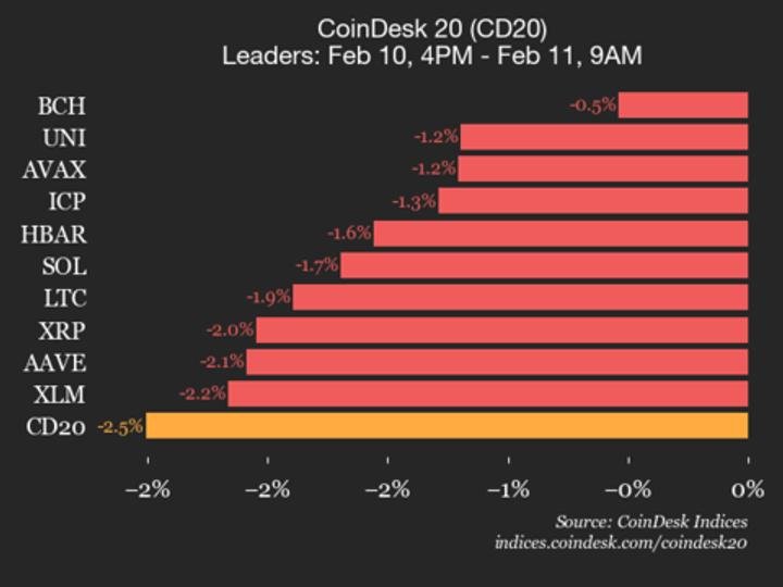 CoinDesk Indices presents its daily market update, highlighting the performance of leaders and laggards in the CoinDesk 20 Index.