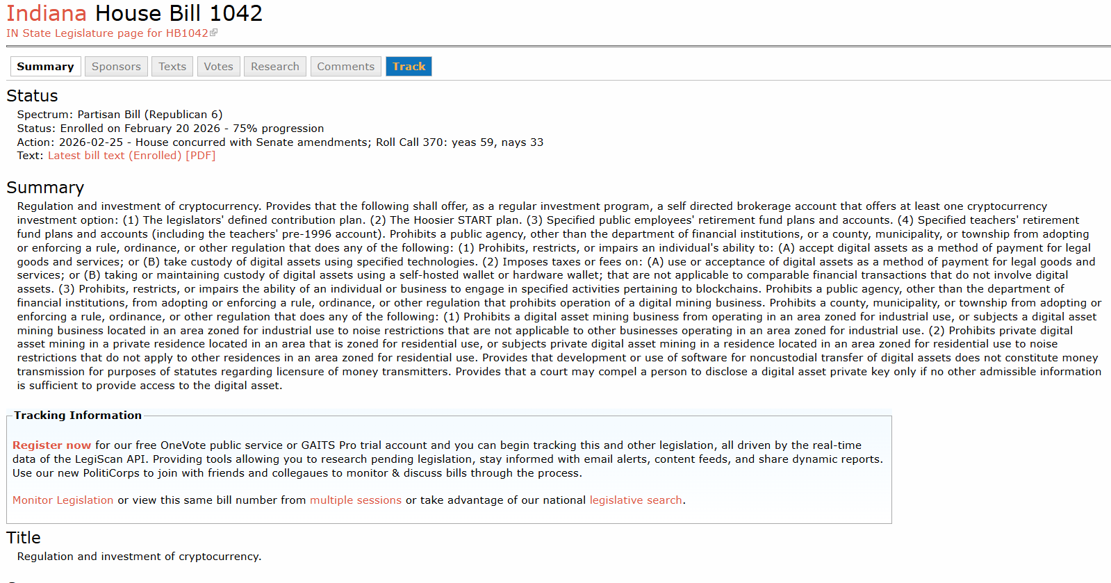 Indiana lawmakers have sent a bill to Governor Mike Braun that would expand legal protections for cryptocurrency users and require certain state retirement and savings plans to offer a self-directed brokerage option with at least one crypto investment choice.