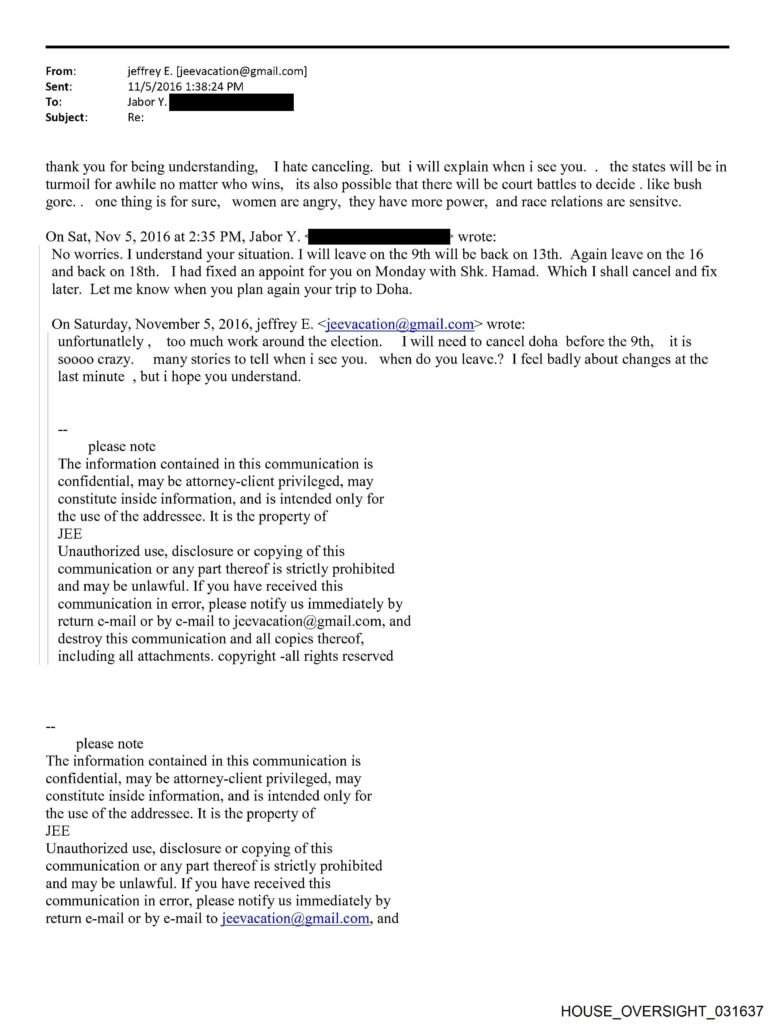 In November 2016, shortly before the U.S. election, Epstein apologized to Jabor for canceling an audience that Jabor had arranged with Hamad bin Khalifa Al Thani, the then-retired emir of Qatar. “[T]oo much work around the election,” Epstein wrote, adding that “the states will be in turmoil for awhile no matter who wins” and promising to “explain when i see you.”