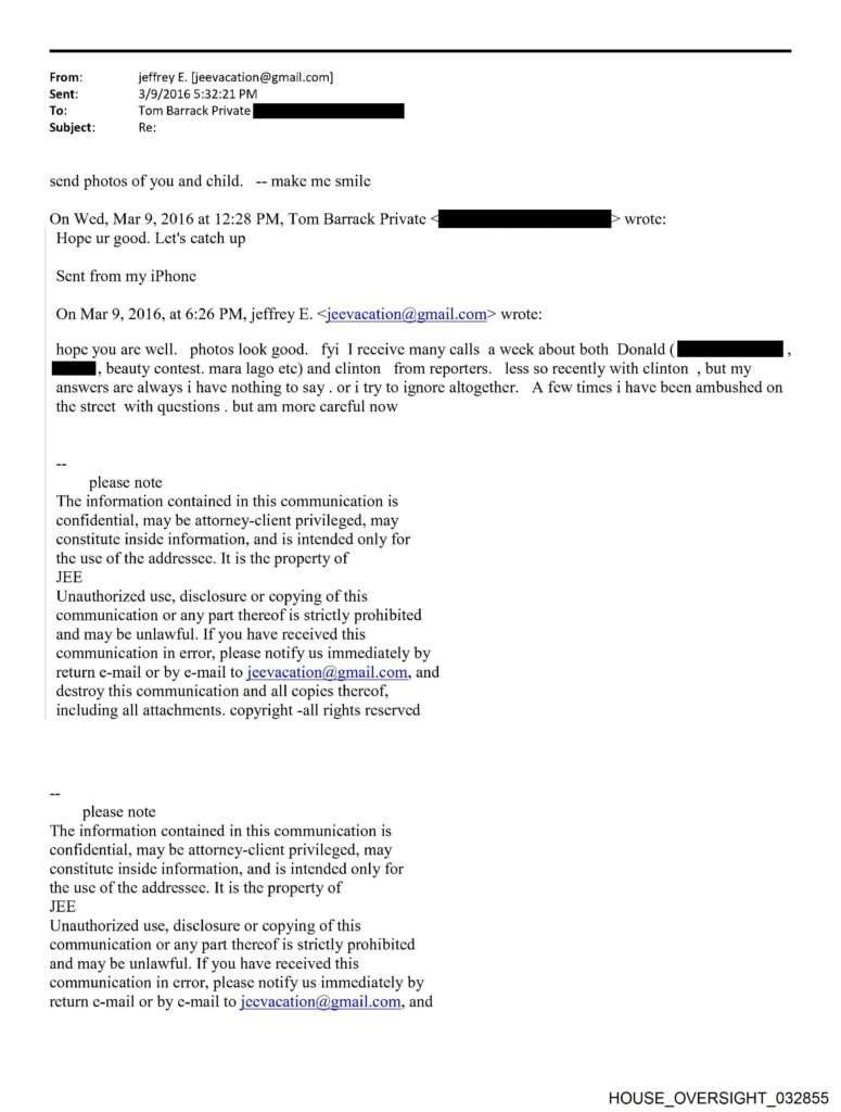 In March 2016, Epstein and Barrack made small talk via email. Barrack asked Epstein to “catch up,” while Epstein complained about the constant questions from the media about his relationships with Trump and former President Bill Clinton. “[S]end photos of you and child,” Epstein added. “[M]ake me smile.”