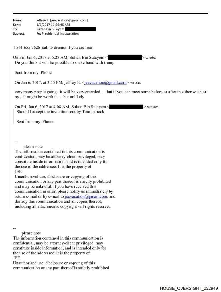 In January 2017, according to the House Oversight Committee emails, Epstein told Emirati businessman Sultan Ahmed bin Sulayem that “it might be worth it” to accept an invitation from Barrack to attend Trump’s inauguration. “Do you think it will be possible to shake hand with trump,” bin Sulayem wrote back. Epstein told bin Sulayem to call him on the phone.