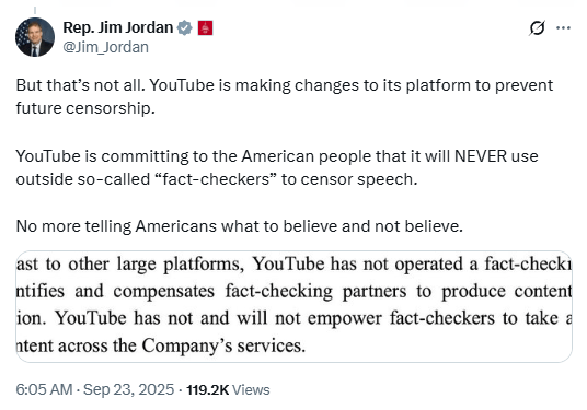 But that’s not all. YouTube is making changes to its platform to prevent future censorship. YouTube is committing to the American people that it will NEVER use outside so-called “fact-checkers” to censor speech. No more telling Americans what to believe and not believe.