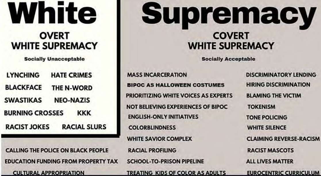Throughout this litigation, the plaintiffs have asserted that the training was essentially an indoctrination focused on the school district’s views and its interpretation of white supremacy. In particular, the school district expected staff to accept its definition of “white supremacy,” which it defined as “the all-encompassing centrality and assumed superiority of people defined and perceived as white.” It instructed staff that we live in a culture “which positions white people and all that is associated with them (whiteness) as ideal.” The school district acknowledged in this litigation that it continuously instructed throughout the trainings that silence from white people is a form of “white supremacy.” One slide published during the training characterized forms of “white supremacy” as overt and socially unacceptable and covert and socially acceptable. [See the first image at the top of this post. -EV]