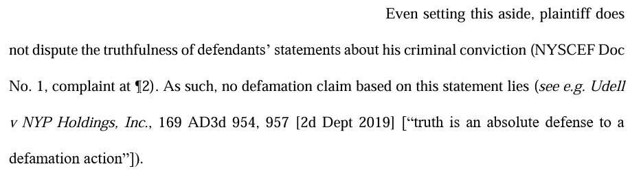 Even setting this aside, plaintiff does not dispute the truthfulness of defendants’ statements about his criminal conviction. As such, no defamation claim based on this statement lies…. “[T]ruth is an absolute defense to a defamation action” ….