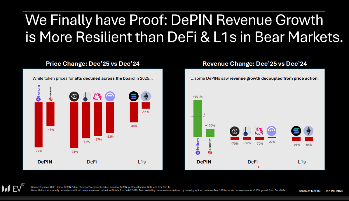 While DePIN tokens such as Helium (HNT) and GEODNET (GEOD) fell 77% and 41% in price from December 2024 to December 2025, their onchain revenue increased roughly 8 time and 1.7 times, respectively, over the same period, versus steep revenue declines for leading DeFi protocols and smart contract chains.