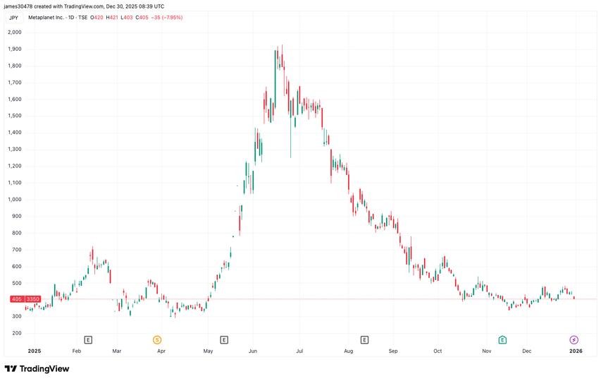 Metaplanet has now spent some $3.78 billion, at an average purchase price of $107,607, according to the company’s dashboard. The company’s shares rose 8% this year, to close at 405 yen ($2.60). Still, they’re down 80% from the all-time high they touched in June.