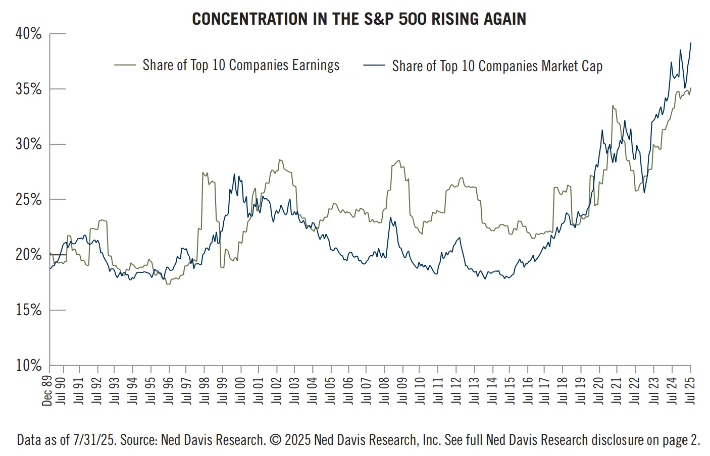 The top ten S&P 500 companies now command more than one third of the index’s total valuation, a concentration not seen in half a century. When so much wealth is tied to so few companies, a stumble becomes a systemic risk.