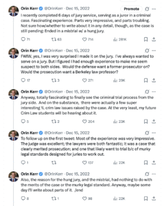 I thought I would flag in response to Josh’s post that I served on a criminal jury three years ago—and that, unlike Josh, I recommend that other law professors do the same. I tweeted a bit about it shortly after my jury service: