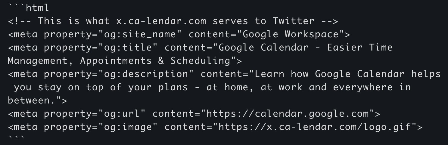 The domain that the message links to is “x(.)ca-lendar(.)com” and was registered on Saturday. Still, X shows the legitimate calendar.google.com in the preview thanks to the site’s metadata exploiting how X generates previews from its metadata.