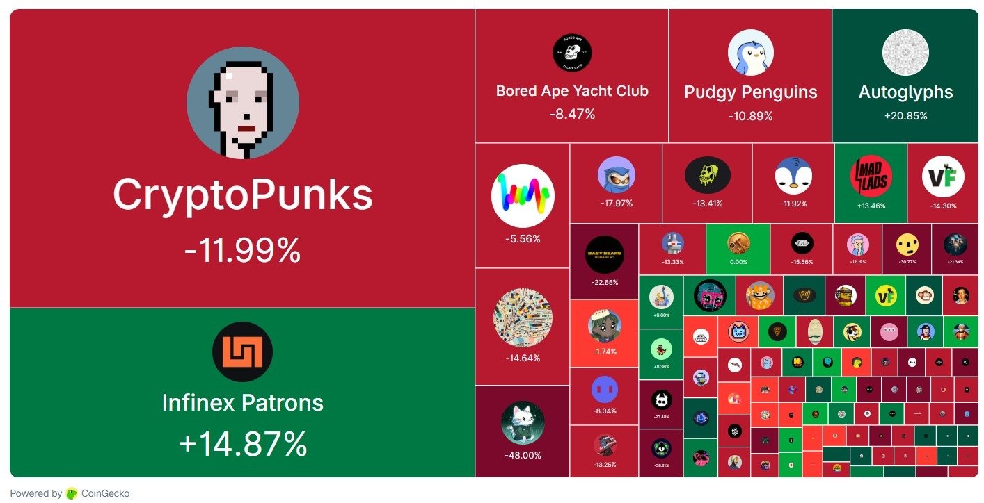 CoinGecko data showed that most of the top NFT collections mirrored the broader market decline, with CryptoPunks, the largest by market cap, falling 12% in the last 30 days.