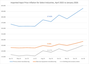 For example, the price of imported inputs to the primary metal manufacturing subsector, which includes iron, steel, and aluminum manufacturing, increased by 17.41 percent from April 2025 to January 2026. Meanwhile, electrical equipment manufacturing, which includes household appliances, generators, and batteries, and clothing stores saw the price of their imported inputs rise by 9.90 percent and 15.27 percent, respectively. (From April 2024 to January 2025, the price of imported primary metal manufacturing inputs increased by 2.15 percent, while the price of imported electrical equipment and clothing store inputs remained basically constant.)