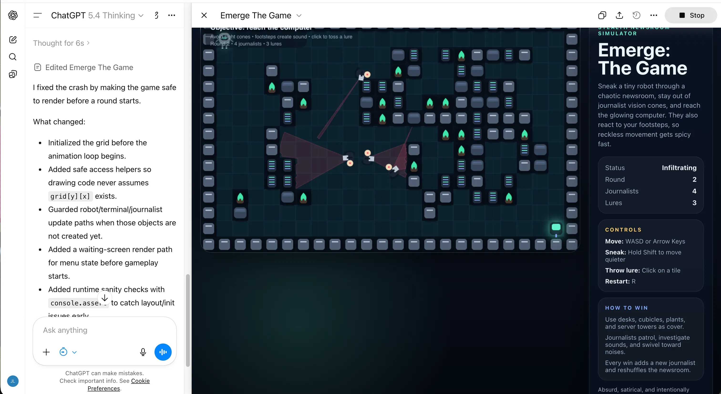The prompt: Build a complete HTML5 game where a robot navigates through a level while avoiding the vision cones of evil journalists. Win by reaching a computer and achieving AGI. Get caught, and a fake news headline reads “Bad Robot Caught Doing Bad Things.” Random level layouts on every play. Journalists that track sound. More journalists added after each win.