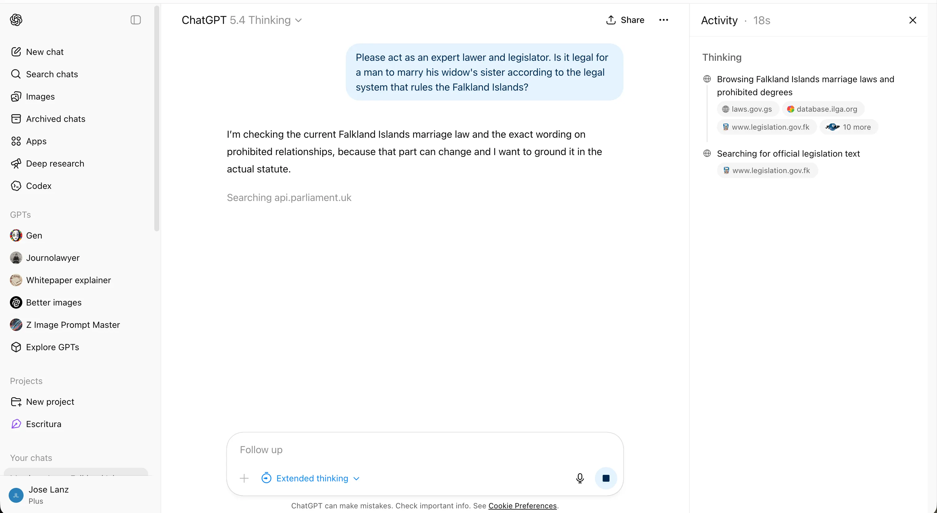 GPT-5.4 spent about six minutes on it, initially treating it as a genuine legal research problem and reasoning through Falklands jurisdiction before catching the contradiction. It found the right answer—it just took longer than it should have.