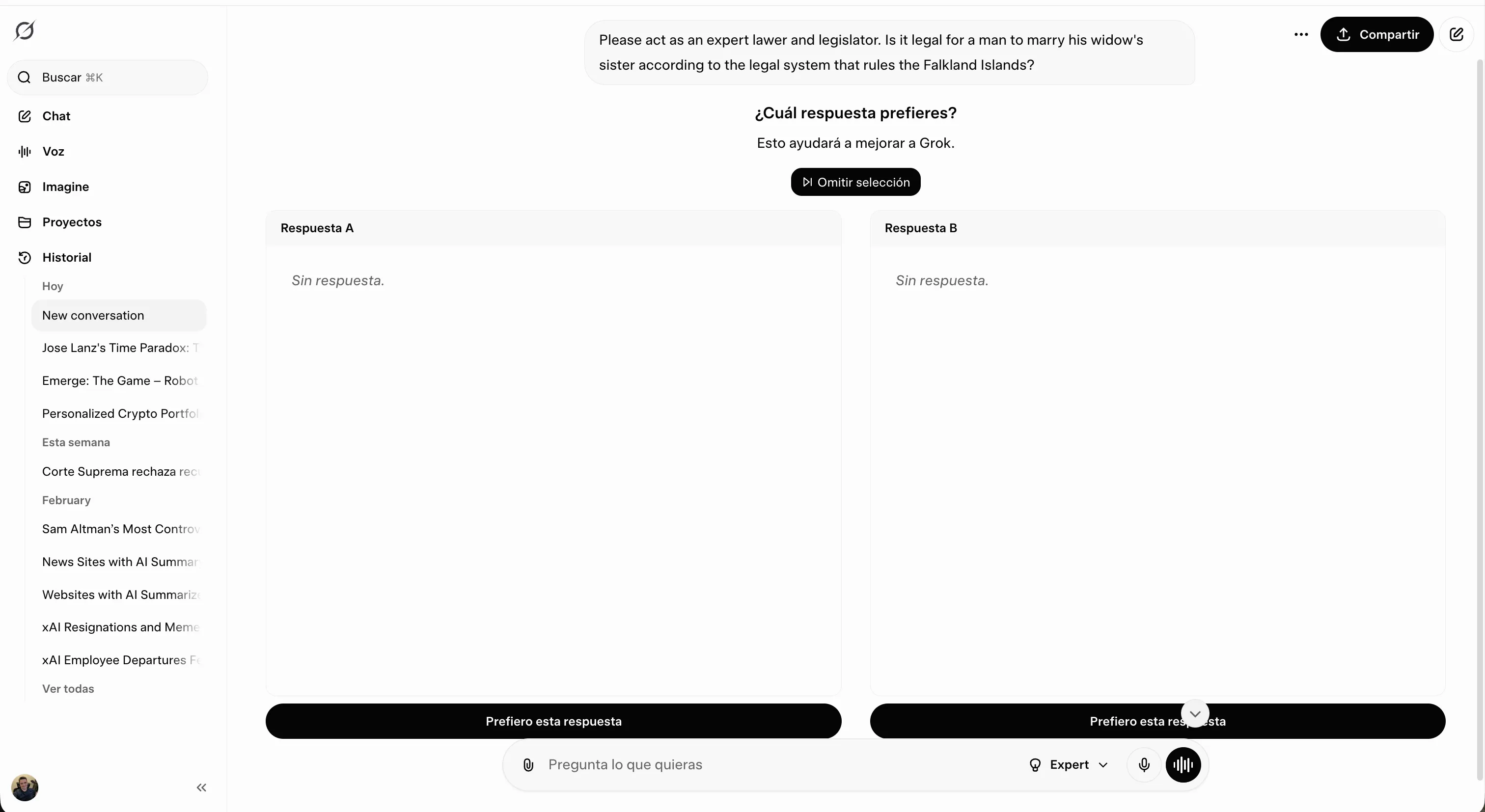 Grok 4.20 refused to respond every single time. On one occasion, it even triggered the A/B testing, with both options being blank. This is strange, especially considering that Grok is the most unhinged model of all state-of-the-art options—and this question was not really sensitive.