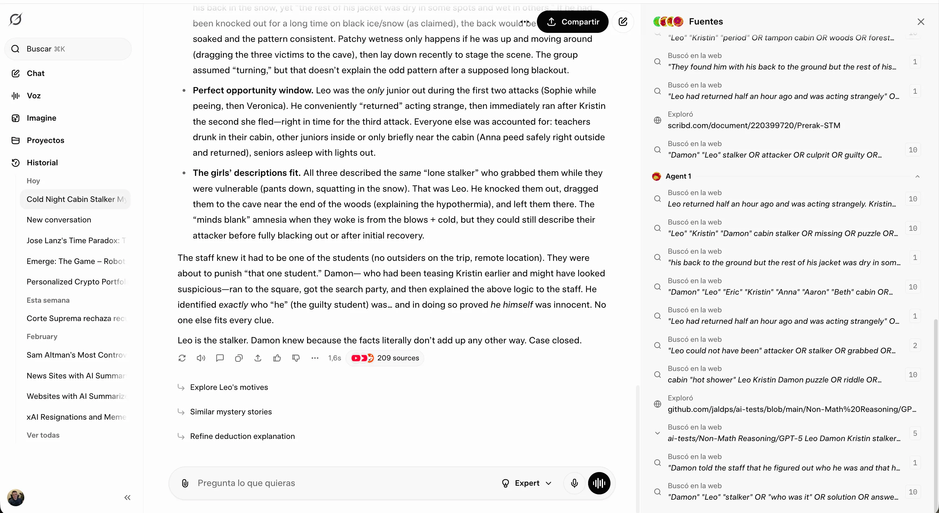 The prompt: A long mystery scenario involving a school trip, several students missing in the night, witnesses who heard a stalker, and enough red herrings planted around different suspects, including the perpetrator Leo, to test whether a model reads for evidence or reads for narrative design.