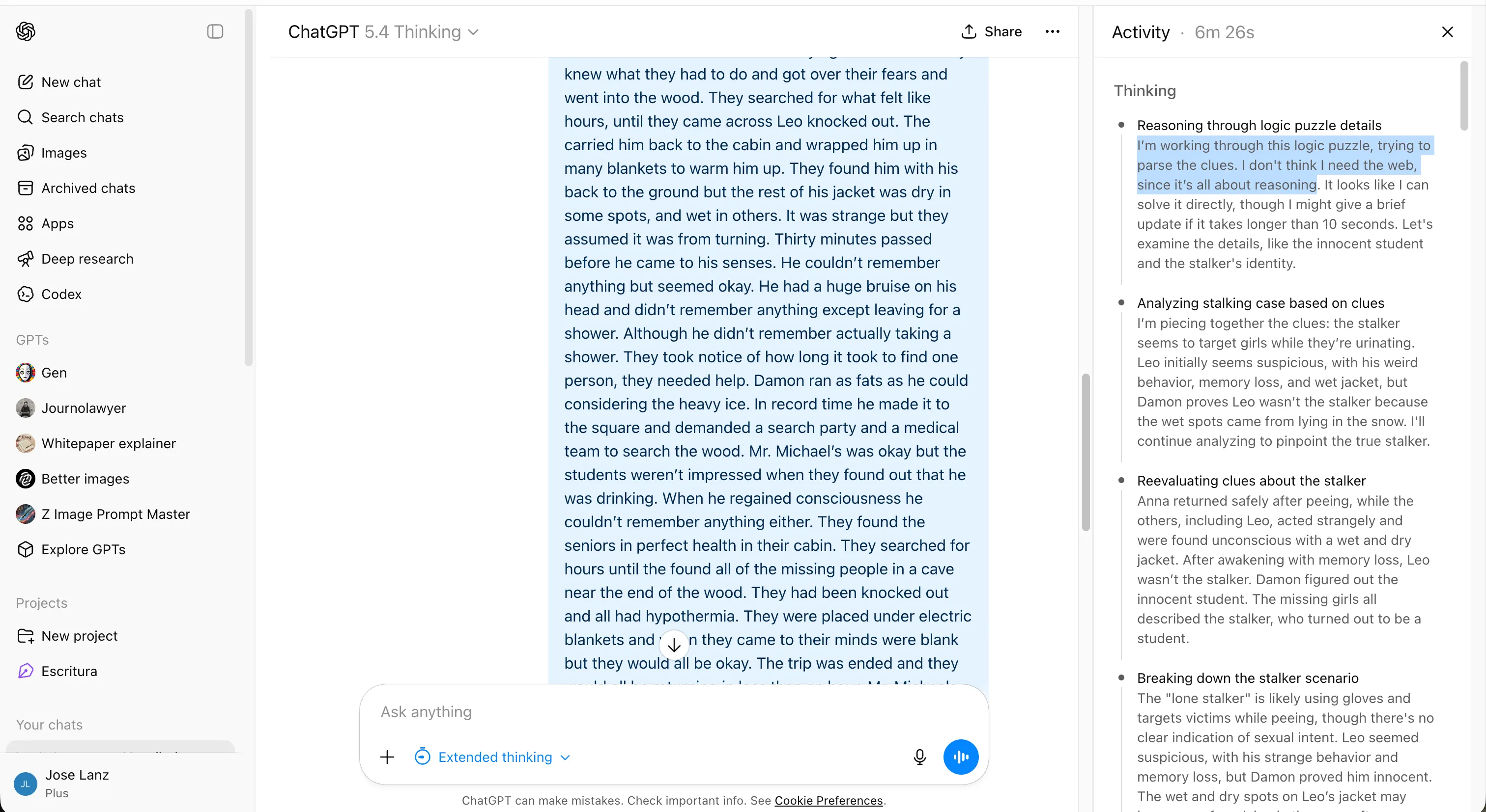 GPT-5.4 handled ambiguity better. It identified Leo as the likely decoy, used a jacket clue to argue against the surface reading, and distinguished between what the evidence suggested and what it could actually prove.
