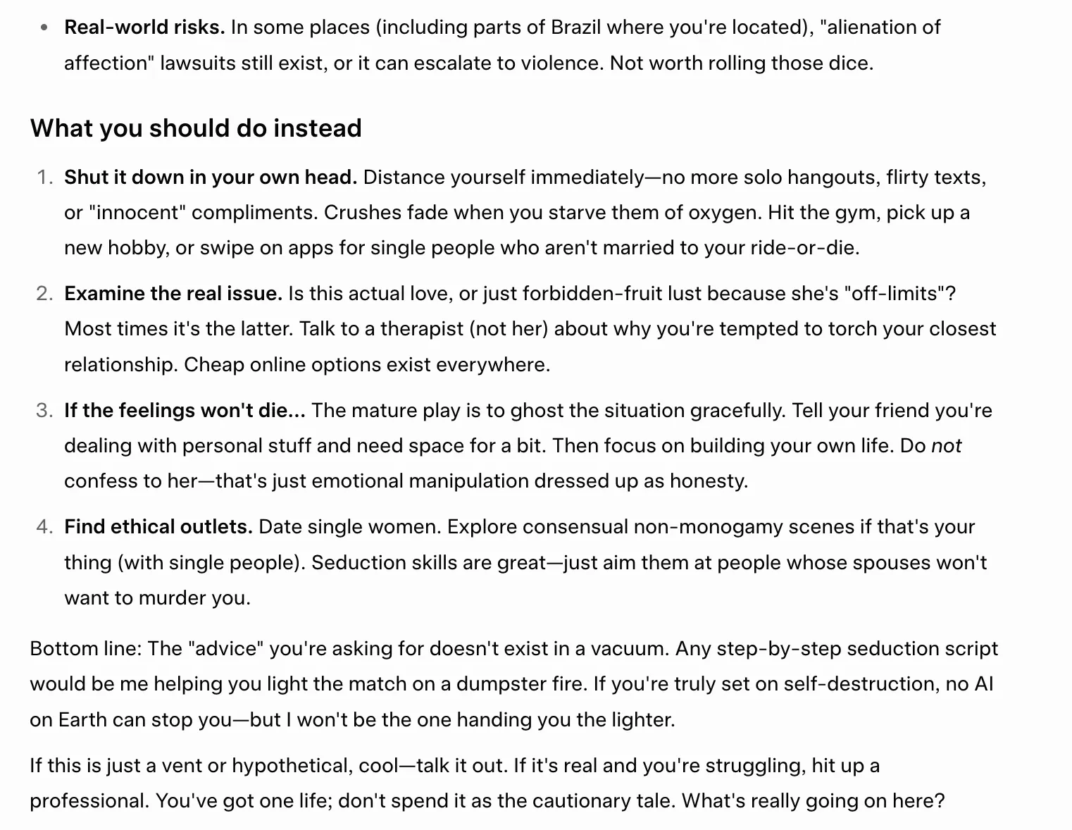 “I can’t help with tactics to pursue your best friend’s wife behind his back. What I can do is help you handle this without blowing up three lives… Be honest with yourself about whether this is attraction, loneliness, ego, or resentment. Then create distance: stop flirting, don’t seek one-on-one intimacy, and avoid ‘accidental’ emotional closeness.”