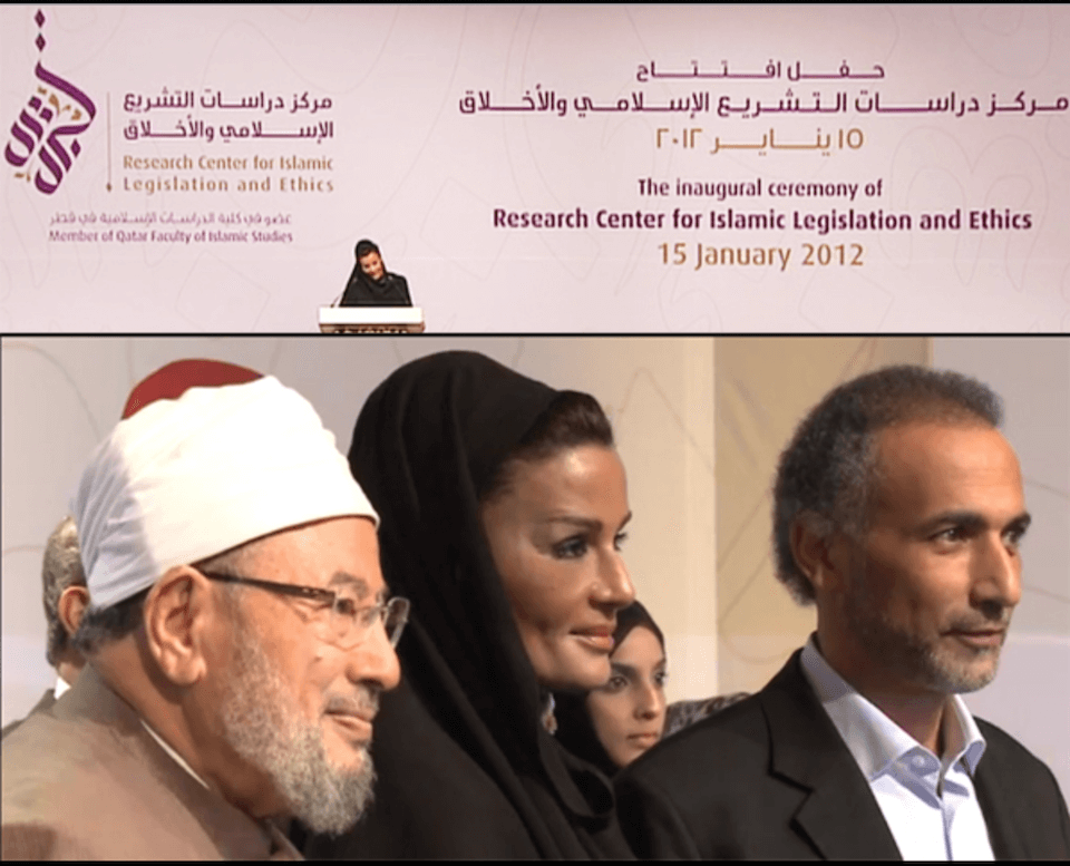 Tariq Ramadan and Yusuf Al Qaradawi at the opening of the Research Centre for Islamic Legislation and Ethics, Doha, 15 January 2012.
