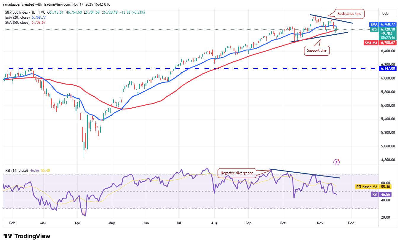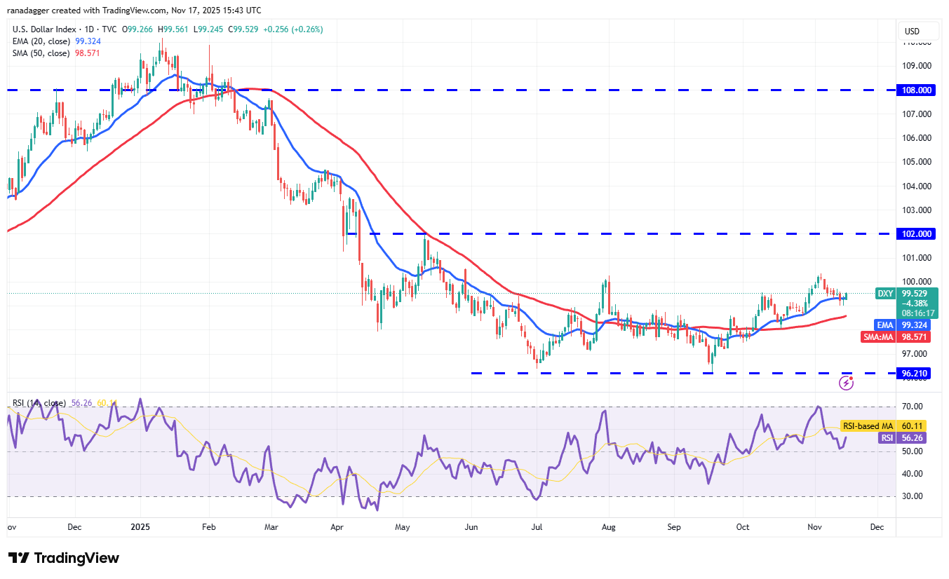The US Dollar Index (DXY) turned down from the 100.50 overhead resistance level on Nov. 5 but is taking support at the 20-day exponential moving average (99.32).