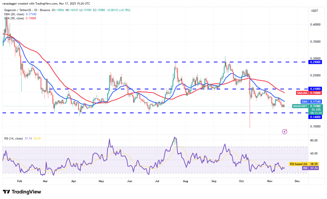 On the contrary, a break and close above the 20-day EMA suggests that selling dries up near $0.14. The DOGE/USDT pair may then rally to the 50-day SMA ($0.19). Such a move indicates that the pair could extend its stay inside the $0.14 to $0.29 range for some more time.