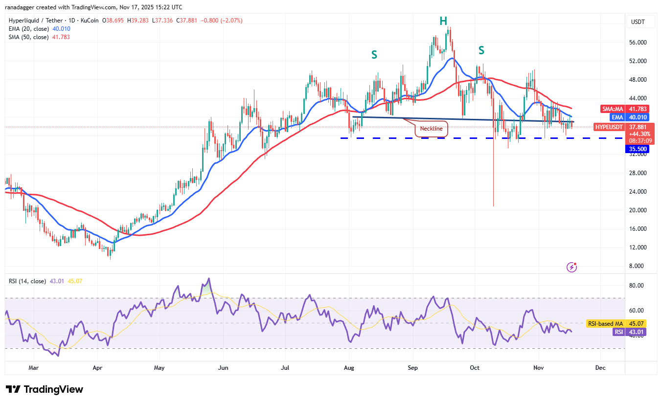 Hyperliquid (HYPE) has been trading between the 50-day SMA ($41.78) and the $35.50 support for the past several days.