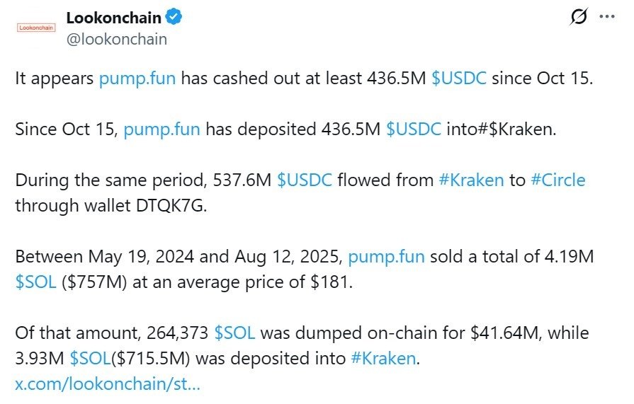 Sapijiju’s comments came after Lookonchain reported that wallets linked to the Solana memecoin launchpad had moved $436 million in USDC to the crypto exchange Kraken since mid-October, which was widely interpreted as a large-scale cash-out.