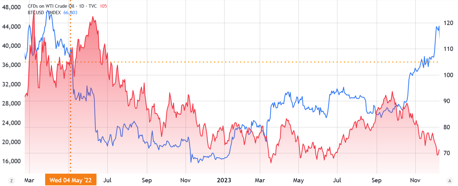 Bitcoin/USD (blue, left) vs. WTI oil (red, right). Source: TradingView