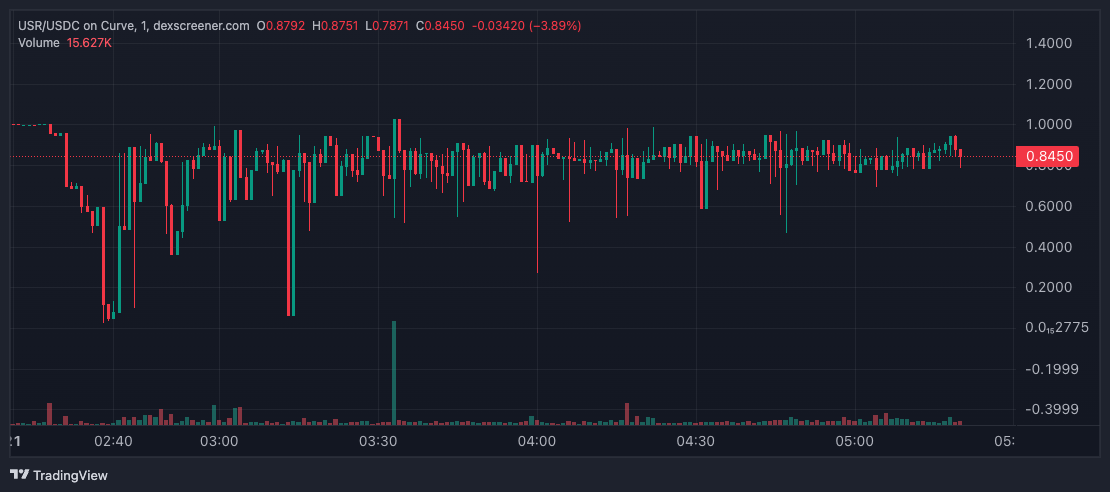 USR hit its bottom on Curve at 2:38 am UTC on Sunday, just 17 minutes after the attacker minted $50 million worth of the token. The pool has since recovered to trade at 84.5 cents.