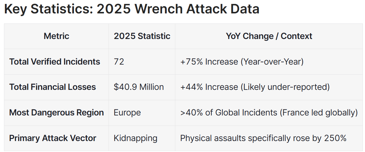 Physical attacks targeting cryptocurrency investors, also known as “wrench attacks,” also increased by 75% during 2025 to 72 verified cases worldwide, according to cybersecurity platform CertiK.