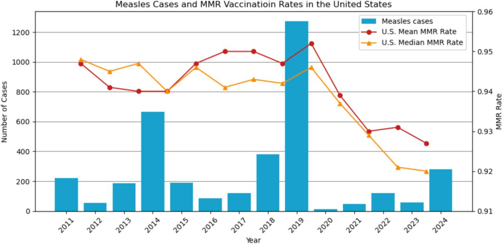 In the year 2,000 (cue the Conan O’Brien music), America had so successfully defeated measles as a disease that we were awarded elimination status for the disease. Then Trump was elected to a second term, for reasons I still can’t fully explain, after which RFK Jr. somehow was confirmed as the Secretary of HHS. Almost simultaneously, a massive measles outbreak began in Texas, spreading to most of the other states in the union, with particularly bad outbreaks in Arizona, Utah, and North Carolina. The reason for the outbreak is clear in the CDC statistics: falling vaccination rates for the MMR vaccine allowed the disease to gain a foothold and spread. Meanwhile, Kennedy offered up confused and confusing messaging to the public as to what do about it, oscillating between muted calls for vaccinations, musing that everyone should just get measles for natural immunity, and declaring out loud that measles victims were at fault for not being healthy enough.