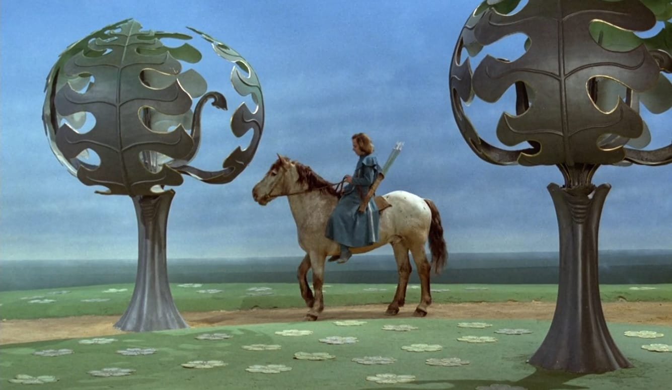 Perceval, on the other hand, is filmed entirely on a circular sound stage at the Epinay Studios outside Paris with the camera and audience placed in the middle of the action. Cinematographer Néstor Almendros bounced his lighting to create flat and shadowless compositions, and the bright costumes mimic the colour schemes of 12th-century manuscripts. With a handful of enormous steel trees standing in for the forest—the futuristic creations of the film’s set designer, Jean-Pierre Kohut-Svelko—and castles clearly constructed out of plywood, the film is artificial from top to bottom. Even the sky is a painted backdrop. The whole thing resembles a cross between a theatrical production and The Wizard of Oz, another colour-saturated sound-stage creation.