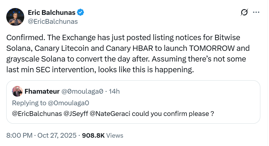At least three altcoin ETFs were expected to launch later on Tuesday: Bitwise’s Solana (SOL) ETF and Canary’s Litecoin (LTC) and Hedera (HBAR) ETFs, according to Bloomberg analyst Eric Balchunas.