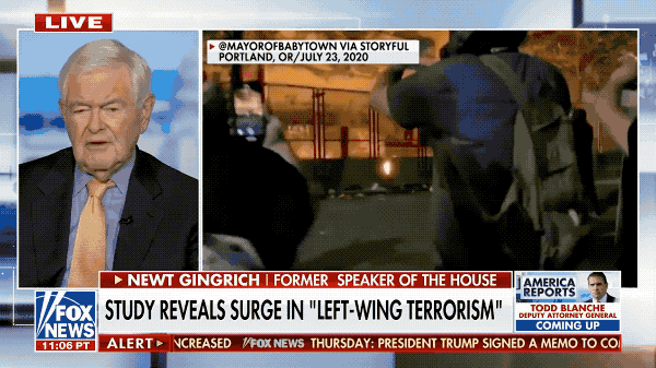 In the next hour, they ran the same playbook. Former House Speaker Newt Gingrich was on, talking about how dangerous the left was next to footage of Portland violence from July 2020.