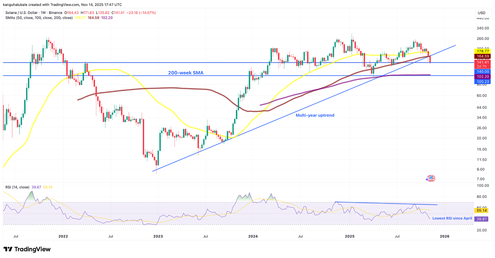 SOL broke its multi-year uptrend, slipping below a key moving average.