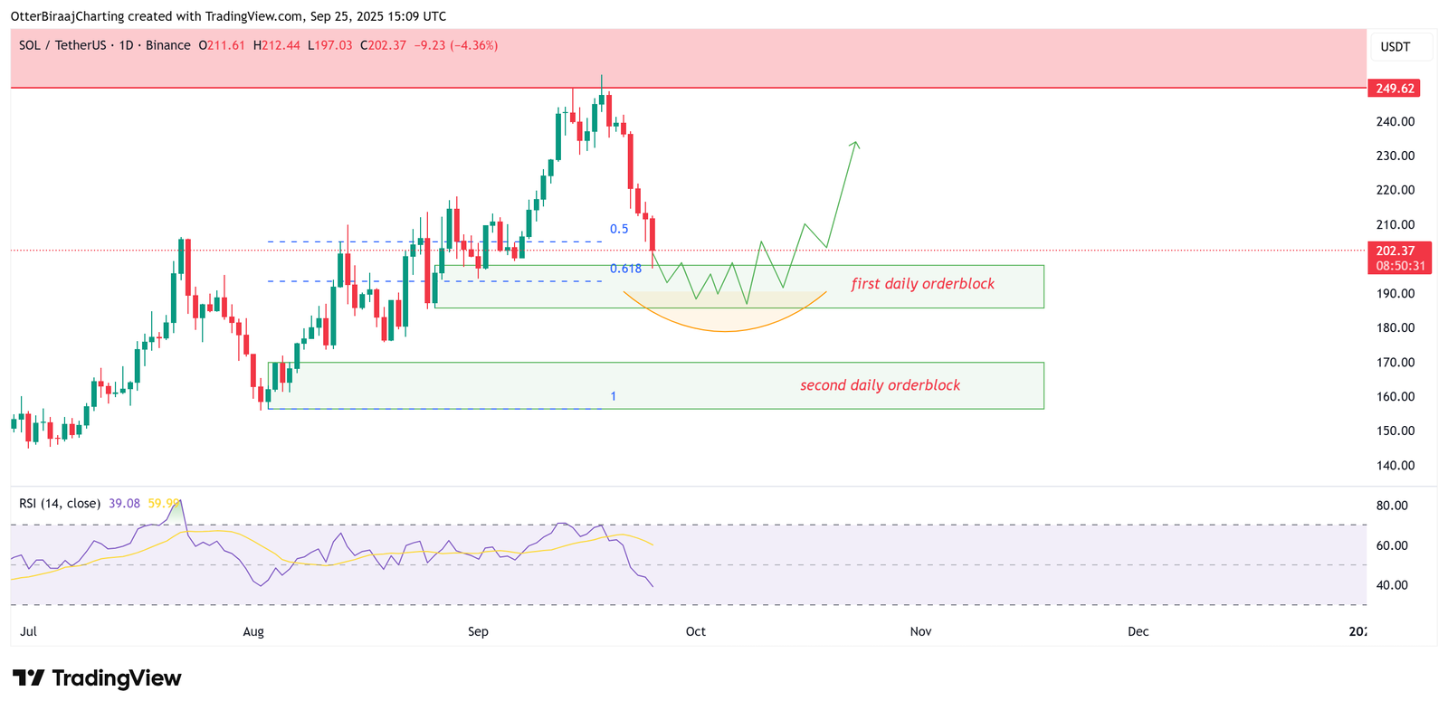 Solana (SOL) slipped below the $200 mark on Thursday, erasing its recent rally to an eight-month high of $253. The 19% dip that unfolded in a week has rattled market momentum and raised questions about near-term strength.