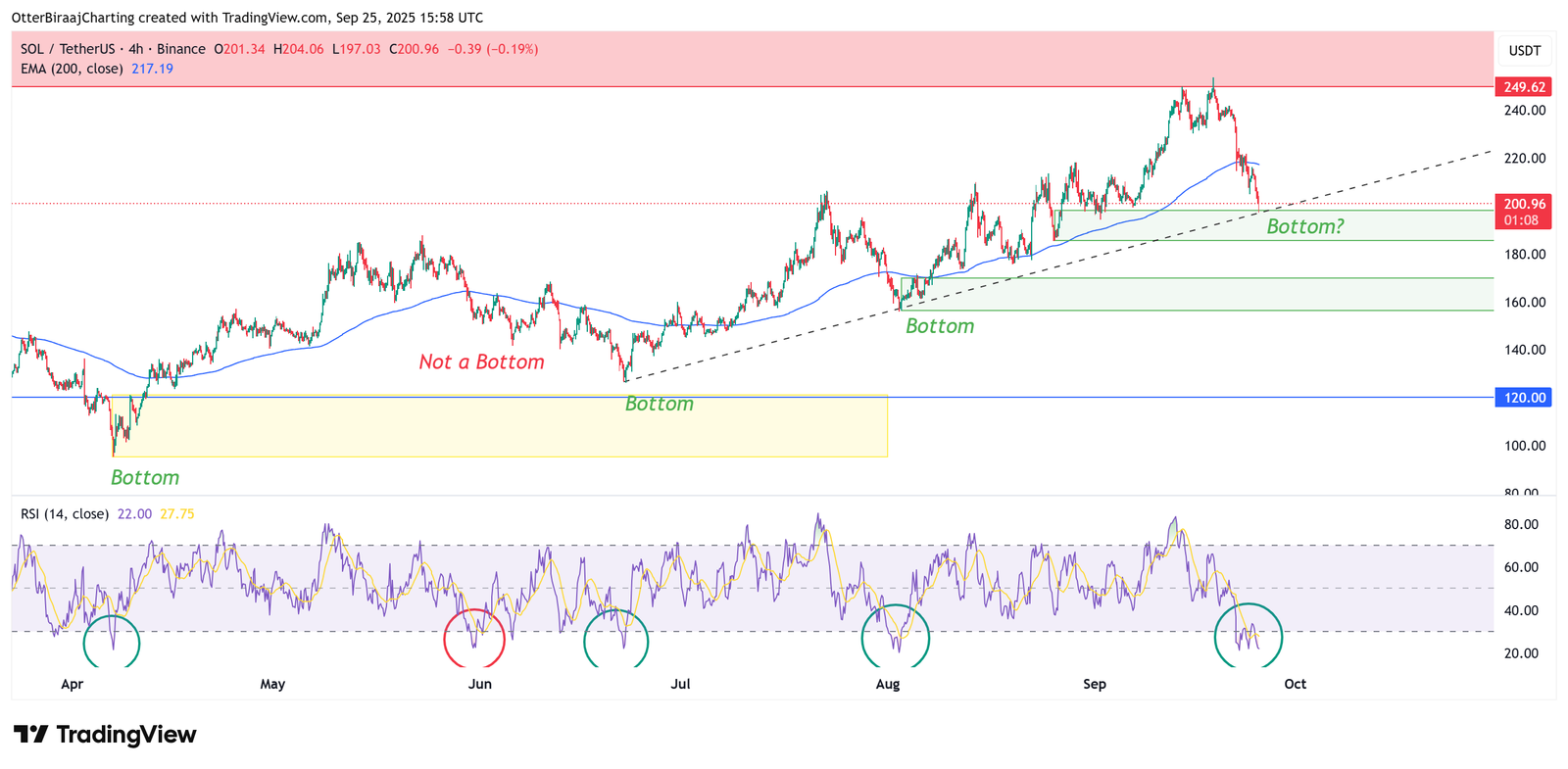 On the intraday side, the four-hour chart is showing signs of sellers’ exhaustion. The Relative Strength Index (RSI) has again dipped below 30, a level that historically signaled bottoms or higher lows for SOL.