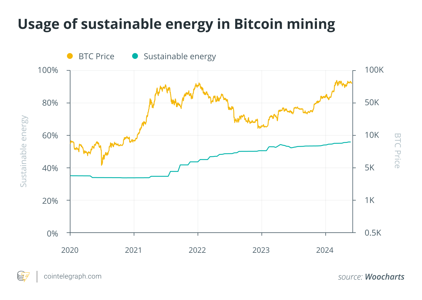Bitcoin mining’s sustainable energy usage has reached an all-time high of over 55%, according to the above graph modeled by climate tech venture capitalist Daniel Batten and Bitcoin analyst Willy Woo.